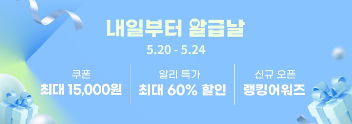 이번에 처음 진행하는 알급날 세일은 매월 마다 진행됩니다. 알급날은 알리익스프레스에서 새롭게 선보이는 또 다른 프로모션으로 매일 돈 버느라 고생한 당신, 더 나은 삶을 위한 더 나은 소비를 위해 알리가 선보이는 엄선된 K-venue 제품의 초특가 할인 행사입니다. 이번 5월 알급날 세일은 4월 20일 00시부터 시작되어 5월 24일 23시 59분까지 세일이 진행됩니다.