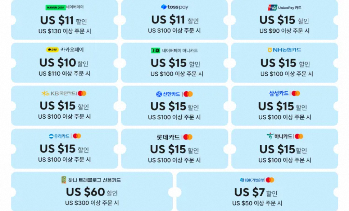 - • $100 이상 → $15 할인: 신한/삼성/국민/우리/롯데/하나/NH/네이버페이 머니카드